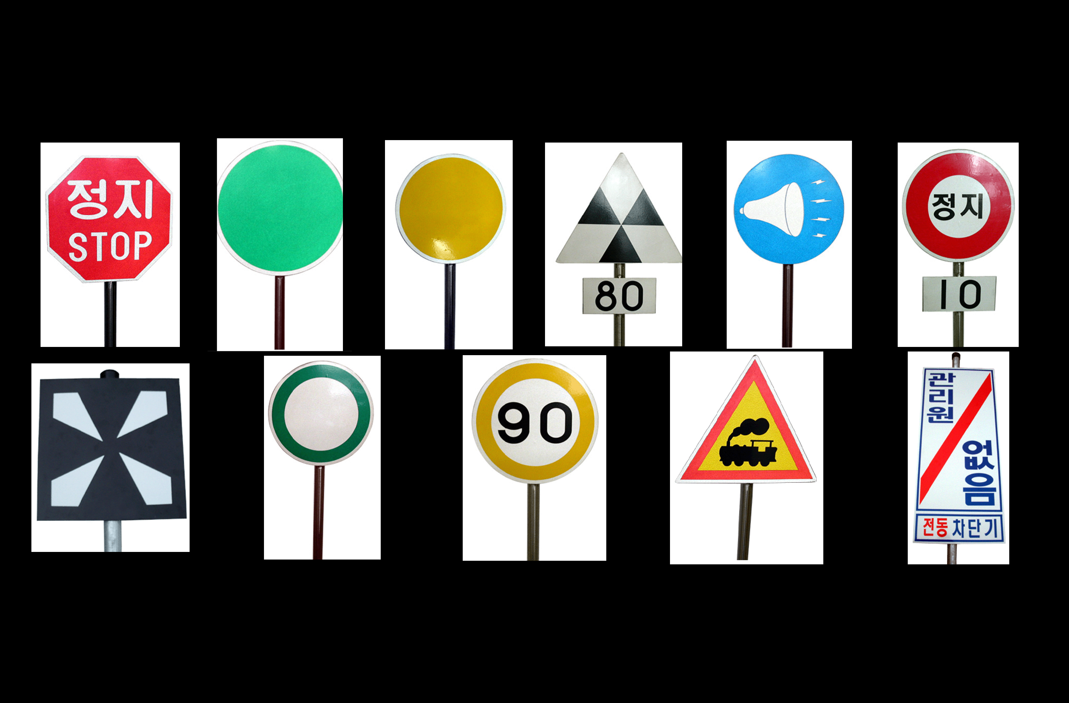 작업표, 공사알림판, 거리표(m표, km표), 곡선표, 구배표, 속도제한표, 속도해제표, 차막이표, 열차정지목표, 기적표, 서행예고표, 서행표, 서행해제표, 서행통과 측정표, 관리원 없음, 건널목경표, 유효장표, 일단정지표, 터널명 제표 등 각종 제표 일체