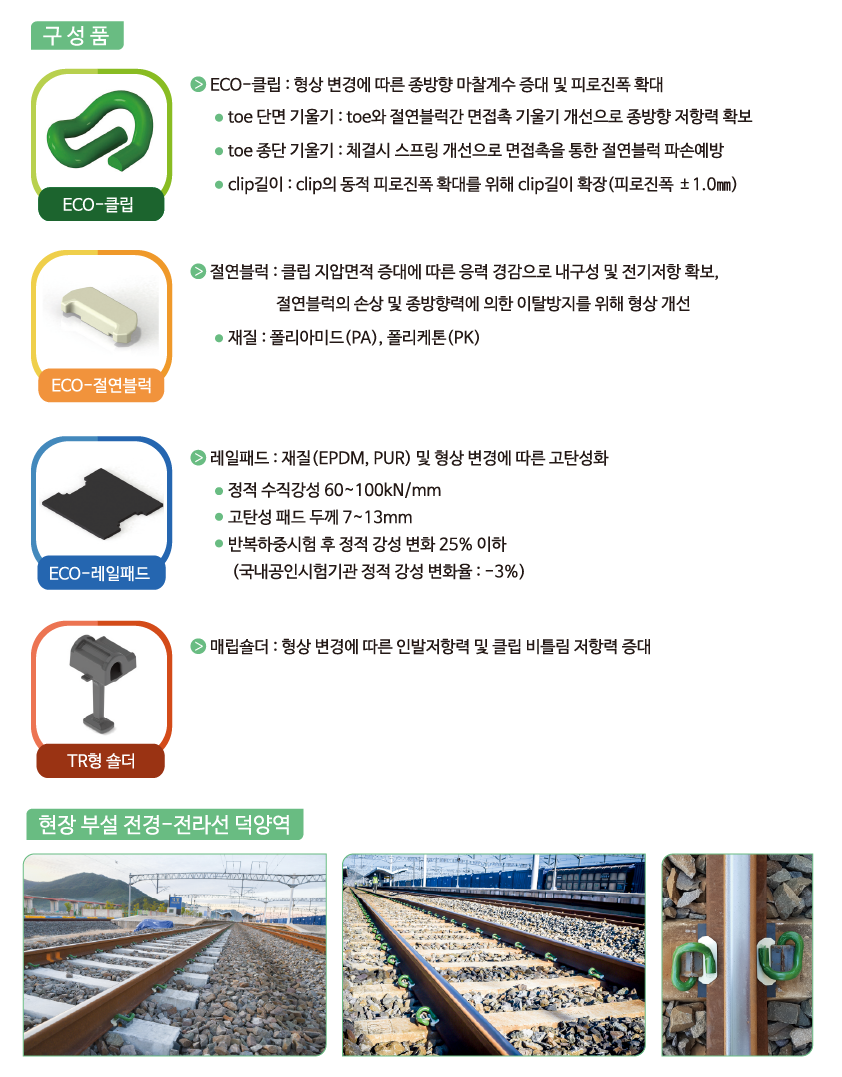 ▪ 고탄성 패드 적용에 따른 종방향, 횡방향 지지에 적합한 클립, 절연블럭, 숄더의 형상 개발로 장기간의 사용성과 유지보수를 줄임
